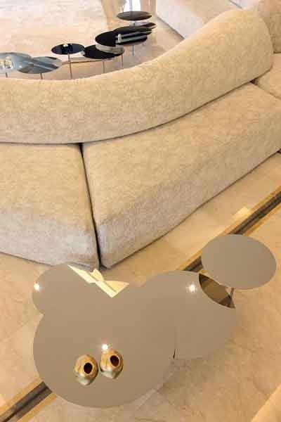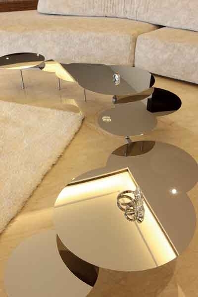 هذه الطاولة قابلتها في الصالون الزاهي مجموعة طاولات عبارة عن مرايا مستديرة يمكن أن تتصل أجزاؤها لتشكّل طاولة واحدة، كما يمكن أن تنفصل عن بعضها وتتوزّع أمام المقاعد بطريقة مفيدة.