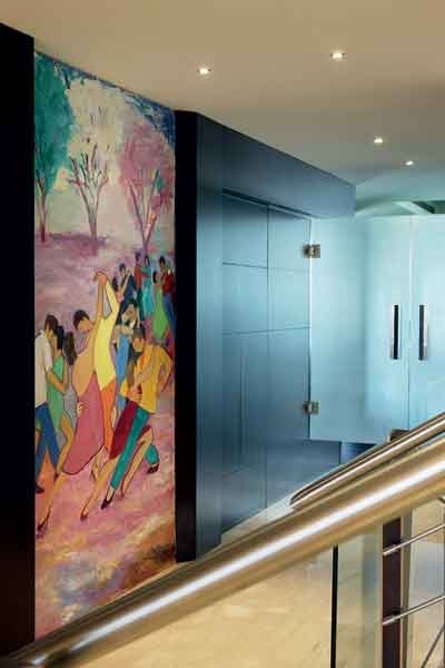 جدار هذه الجلسة من الحجر البيج الداكن علّقت عليه لوحة زيتية تضج بالحياة من خلال ألوانها والصورة الراقصة التي تجسّدها، وهي واحدة من اللوحات العديدة التي ارتسمت على جدران هذا المسكن، من توقيع الرسامة، شقيقة صاحبة المنزل.