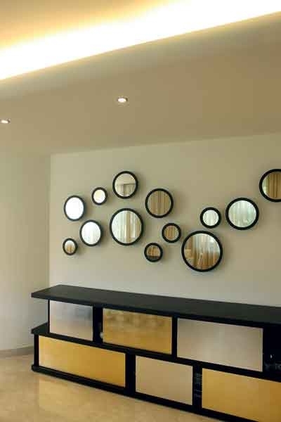 وتستوقفنا هنا مجموعة مرايا بشكل واحد مستدير، لكن بمقاسات مختلفة متداخلة، من تشكيلة «Porada» تعلو دروسوار درفه مزيج من الذهبي والفضي، تفتح بطريقة السحب.