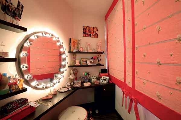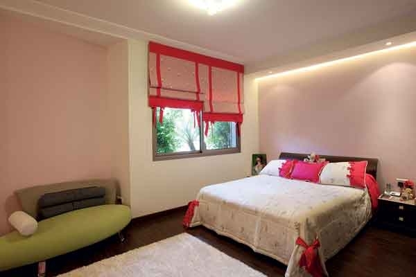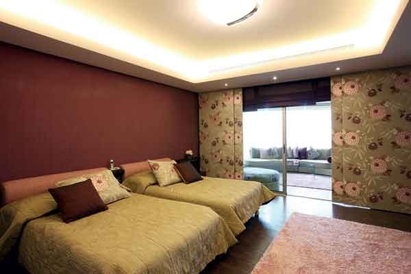 ستائر الغرفة عبارة عن لوحات من القماش الحرير المطعّم بالورد تفتح لتطلّ على غرفة جلوس من الألوان ذاتها.