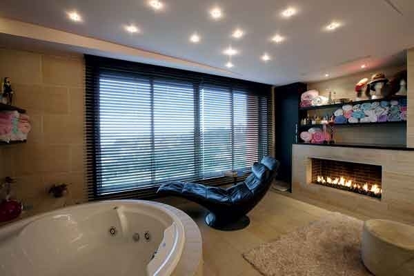 أما غرفة الملكين، فالمبتكر فيها أنّ حمامها الذي ضمّ الجاكوزي فيه مدفأة في الحائط، تعلوها الخزائن التي ضمّت المناشف.