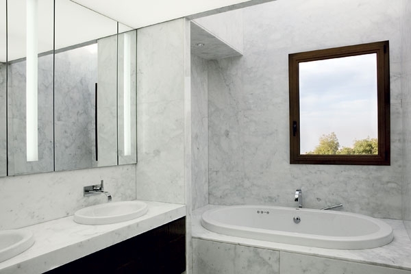 استُعمل للحمامات بلاط «مايكل أنجلو» باللونين الأسود والأبيض مع الخشب الفنغيه، مع جاكوزي وخزائن واسعة.