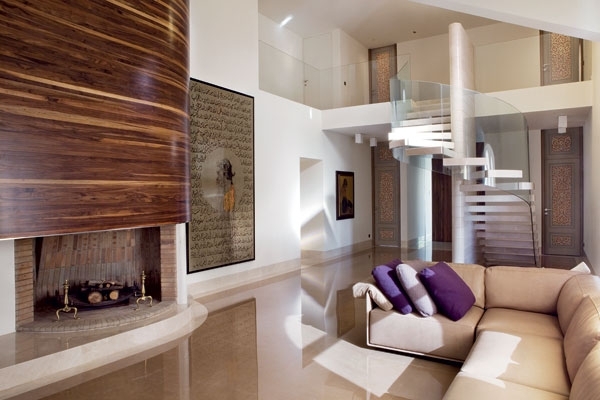 وفي أحد الصالونات، حيث جلسة كبيرة من صوفا بطراز تشسترفيلد بلون أبيض وطاولات دائرية في الوسط وكرسيين من الجلد البني، جدار مشغول بالخشب وقنطرة شرقية تشكل باب عبور.