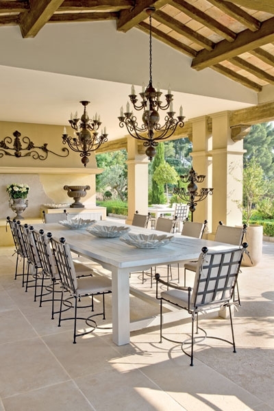 ففي الجانب المسقوف من الشرفة الخارجية، نسقت طاولة رحبة من الخشب الأبيض لتجتمع حولها الأسرة والأصدقاء لتناول وجبات شهية.