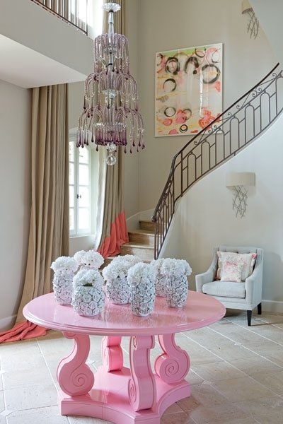 توزعت فوق جدران هذه المساحة الداخلية من المدخل بعض الأعمال الفنية، بينما تدلت احدى الثريات المزخرفة والمطعمة بالكريستال الزهري فوق الطاولة، والتي بدا انعكاس النور فوقها أشبه بعملية تواصل زخرفي انيق مثير للدهشة، تدعمه ومضات من النور الطبيعي المتسلل بنعومة عبر النافذة العملاقة.