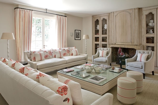 وقد نُسقت حول المدفأة جلسات تتوزعها ارائك كبيرة الأحجام يغطيها قماش من الكتان و تزينها مساند ووسائد من القماش المزخرف بازهار من اللون البرتقالي، لون نجده بخيوط دقية في قماش الطنافس التي تحمل توقيع انديا مهدافي، وكذلك في الطاولة المنخفضة التي تتوسط الجلسة وهي ملبسة بالقماش نفسه وقد زين سطحها بلوح من الزجاج.