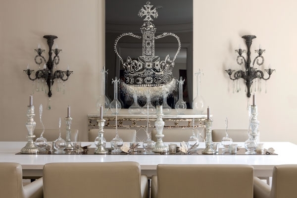 غرفة الطعام تشكل في اجوائها امتدادا جميلا لتلك المناخات الزخرفية المميزة، تنبسط فيها طاولة مدهشة تصطف حولها مجموعة من الكراسي المريحة، بينما تزين سطح الطاولة مجموعة رائعة من الشمعدانات والاكسسوارات الجميلة التي تغذي فضاء المكان برونق مدهش.
