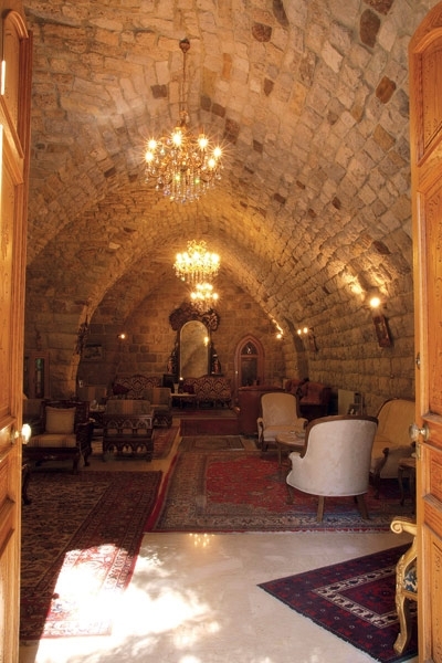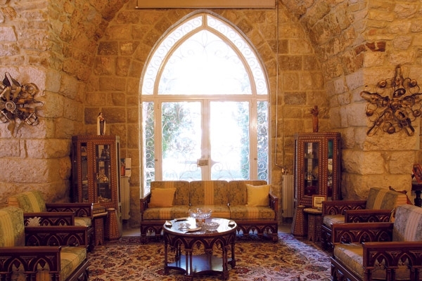 القناطر والحجر المنحوت تختصر المشهد الداخلي. فالحجر الزاهي اللون تتخلّله حجارة باللون البني، توزّعت على الجدران وفي السقف.