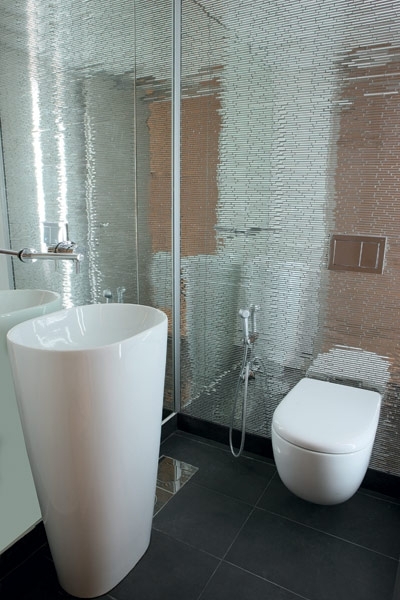 غرفة الجلوس يمكن أن تستقل كركن خاص أو أن تنفتح على بقية الأجزاء بفضل باب مبتكر التصميم من الزجاج المخطوط برسوم، وعندما يفتح يمكن أن يلعب دور لوحة.