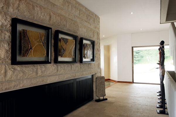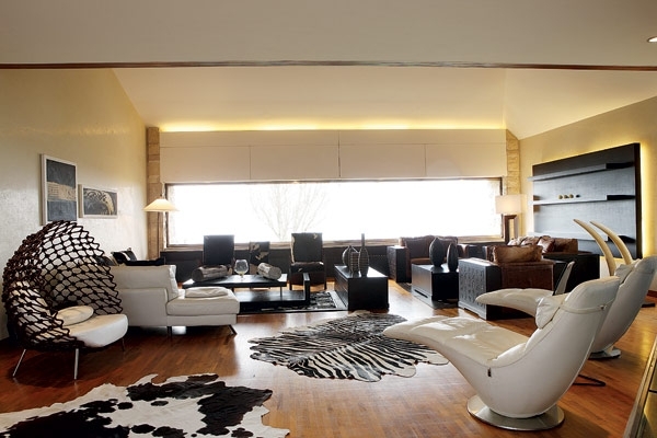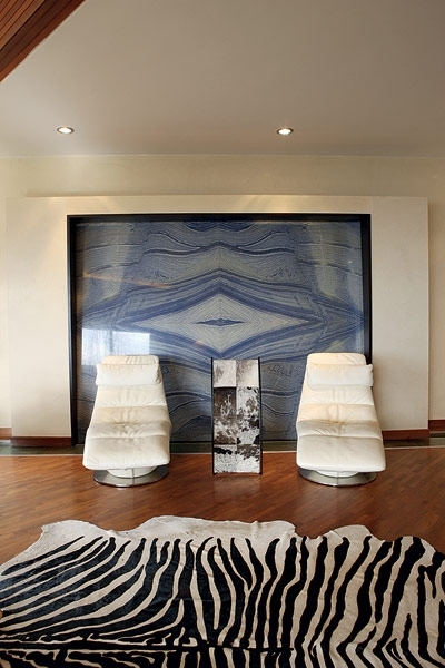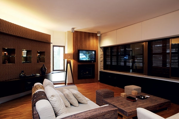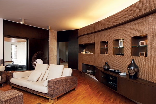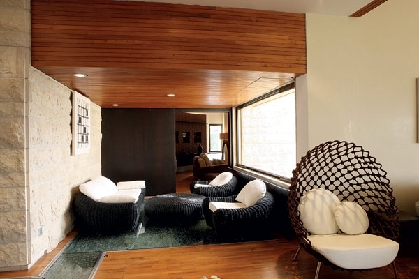 ووُضعت كنبتان من البامبو المجدول وبتصميم واسع بحيث يتسنى للجالس ان يتمتع بمشاهدة التلفاز الذي يعلو مدفأة تعمل على الحطب ملتحفة بالخشب الـ»زيبرانو» الأفريقي لتبعث الدفء في أرجاء الغرفة.