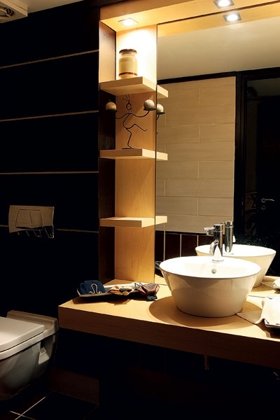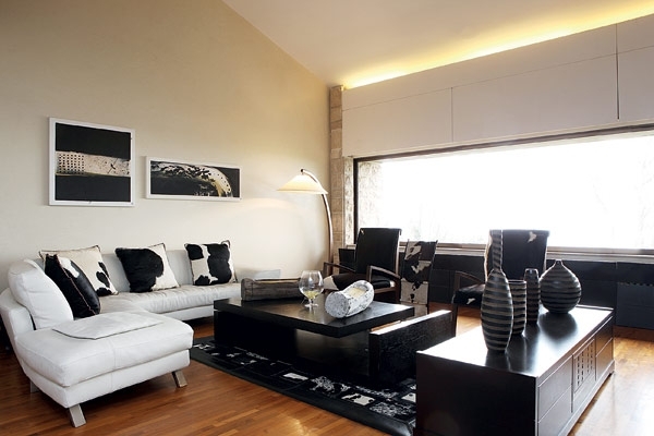 كثيرة هي الطاولات الموزعة في وسط الصالونات وكأنها تترابط الواحدة تلو الأخرى لتزدان بالأكسسوارات المختلفة، ومنها قطعتان كبيرتان من العاج الافريقي تنحدران عند أحد زوايا الصالون البني حيث تبرز الى جانبهما مكتبة معلّقة في الحائط مع إنارة مخفية.