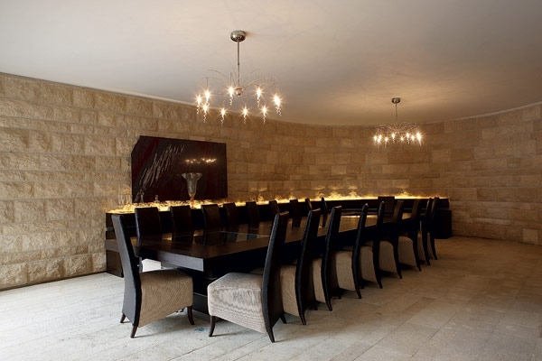 تستقل غرفة الطعام مفتوحةً مع تغييب بابها باتجاه الصالونات. وهنا الحجر يستقل بجزء من المكان بحيث احتل الجدران والارض. واللافت رحابة هذه الغرفة التي تتسع لنحو 30 شخصاً.