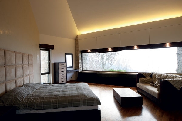 وتمتاز غرفة النوم الرئيسية منها بسقف مرتفع وجدران منحدرة ولها ألوان مختلفة من بيج فاتح وداكن مع الحجر الموزع تحت النافذة.