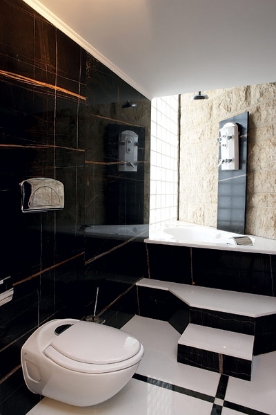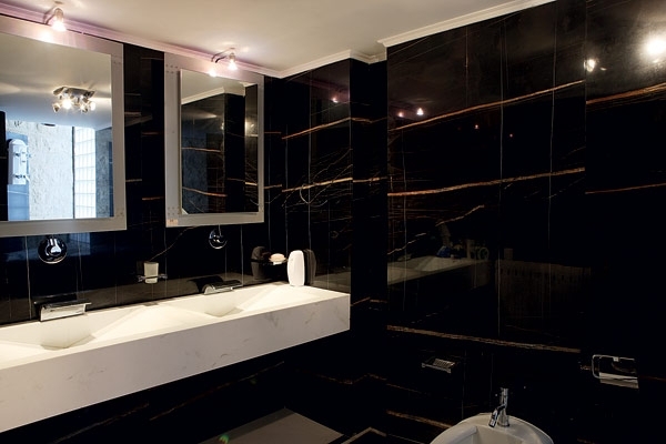 أما الاثاث فيتألف من طاقم للجلوس باللونين الاسود والبرتقالي إضافة الى تلفاز معلّق على رخامة كبيرة جدا مع إنارة غير مباشرة خلف الرخام، ليشاهد المرء المكان من كل الزوايا.