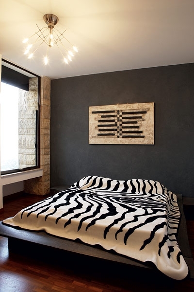 واللافت أن غرف نوم الأولاد ليست تقليدية فكل منها تتوزع في قسمين. وتضم كل من الغرف سريراً كبيراً أسود يفترشه غطاء مشغول بجلد النمر وتبرز فوقه لوحة كبيرة بمربّعات بيضاء وسوداء.
