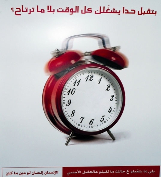 - البند الثامن: يتعهّد الفريق الأوّل بتأمين شروط وظروف العمل اللائق وتوفير حاجاته من مأكل وملبس وإقامة تحترم فيها كرامة الفريق الثاني وحقّه في الخصوصية( كرامة تسْفاو هدرتها بشدة السيّدة نادين).