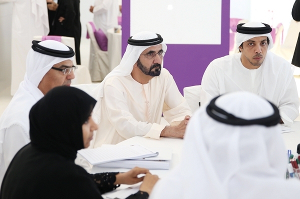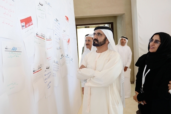 وفي «مختبر الإبداع الحكومي» تم تقسيم جميع الحضور من وزراء ومتخصصين ومشاركين من أهل الميدان إلى خمس مجموعات رئيسية، عملت كل منها على مناقشة محور من محاور التطوير المحددة بناء على ما ورد من أفكار في العصف الذهني الإماراتي.