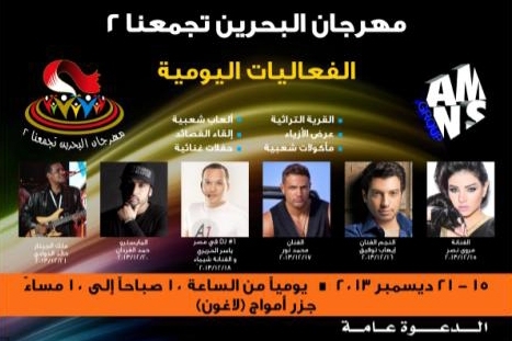 ويشتمل المهرجان المقامة فعالياته في لاغون جزر أمواج، وبتنظيم شركة AMNS، على حفلات غنائية لنجوم وفنانين من الوطن العربي، حيث سيحيي الفنانين إيهاب توفيق ومروة نصر حفلة مساء اليوم، فيما سيحيي الفنان محمد نور حفلة مساء الثلاثاء، ويعقبه في اليوم التالي فنان الدي جي الأول في مصر ياسر الحريري والفنانة شيماء، كما سيحيي المايسترو حمد الفردان حفلة مساء الخميس، ويختتم أيام المهرجان ملك الجيتار البحريني خالد الذوادي.