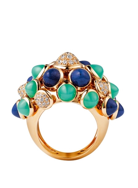 يليق بنسيم باريس المنعش كل شيء، حيث تخترق أشعة الشمس الشقيّة الغمام لتداعب حدائق المدينة. ضفة النهر الغربية هي المكان الذي تزدهر فيه أزهار الخيال الباريسي، وتتفجر الألوان في ترتيلة للفرح الذي يرسم الدوائر على الماء. استمتعي بالمجوهرات المتحركة، لوالب تتقاطع فيها جزيئات الأونيكس والماس واللابيس لازولي. تصاميم غير مسبوقة تداعب البشرة وتنبض باللون والانحناءات، إنها لعبة المجوهرات المصنوعة من الأشعة الذهبية.