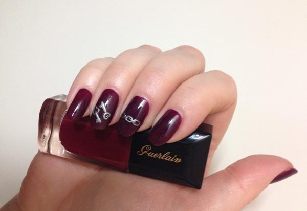 إذا كنت مدعوة إلى مناسبة وتريدين أن تبدو أظافرك أنيقة ومميّزة، اختاري لها اللون العنّابي الداكن. هنا مثلا، استعملت Vernis a Ongle no.168 من Guerlain. إطلي أظافرك باللون المختار، ثم زيّنيها بلصقات فضيّة اللون على شكل مفاتيح أو سلاسل معدنية، وغلفيها بملمع الأظافر Top Coat الذي يساعد على تثبيت اللصقات وجفاف اللون في ثوان معدودة.