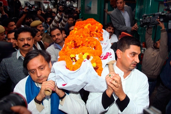 تم العثور على سوناندا بوشكار (52 عاماً) جثة هامدة في جناح رقم 345 الفخم في فندق Leela Palace في دلهي بعد أن غرّدت عبر تويتر عن علاقة زوجها السياسي بصحافية باكستانية. لكن الأخيرة نفت الأمر موضحة بأنها صديقته ويتبادلان التعليقات على مقالات تكتبها بينما أوضح الزوج بأن حسابه عبر تويتر تعرّض للخرق. سوناندا، هي زوجة وزير الدولة الهندي لشؤون الموارد البشرية شاشي ثارور (57 عاماً)، التي كشفت علاقته بصحافية الباكستانية مهر تارار قبل أيام من موتها الغامض. أشار تشريح الجثة أن الوفاة "مفاجأة وغير طبيعية" وأن جسمها يحمل علامات أذى، لكن ليست السبب في وفاتها بالضرورة. وحسب القانون الجرمي الهندي، يرفع القاضي دعوى إن ماتت الزوجة خلال سنوات الزواج السبع الأولى (سوناندا وشاشي تزوجا نهاية عام 2010، وهو الزواج الثالث لكليهما).