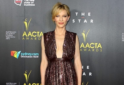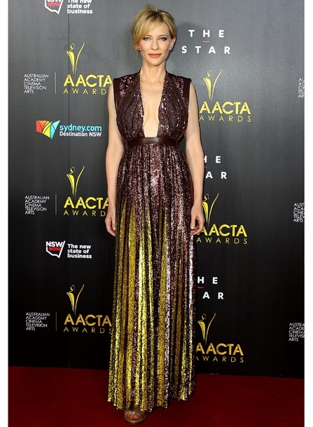 اختارت النجمة كايت بلانشيت أزياء Givenchy by Ricardo Tisci لحضور حفلة توزيع جوائز AACTA في أوستراليا، وأطلّت بفستان صمّم لها خصيصاً، معدنيّ طويل لمّاع ومطرّز بكامله بالباييت، بألوان البنيّ والبرونز والأخضر، مع حذاء ذهبيّ مفتوح. واختارت مع هذا الفستان المتلألئ تسريحة شينيون بسيطة وعصريّة وماكياج طبيعيّ بألوان حياديّة.