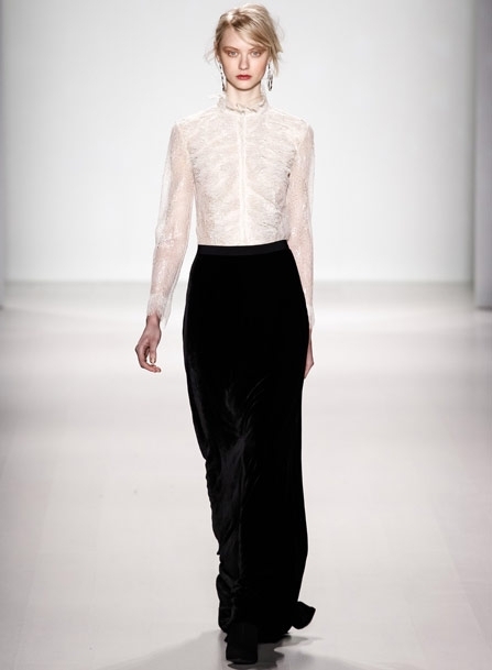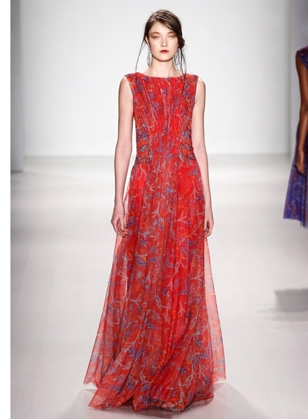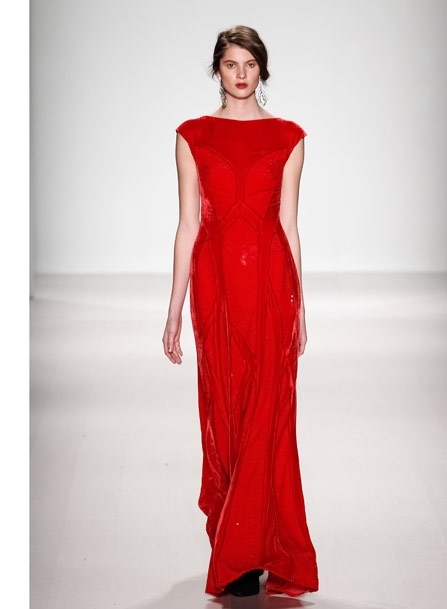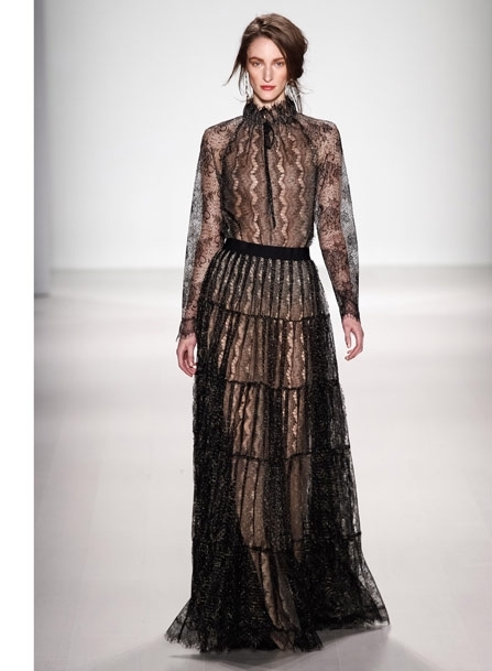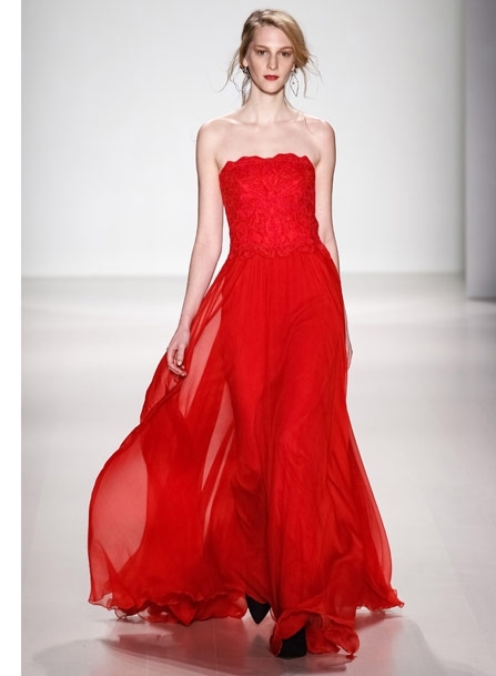 طغت التصاميم الرومانسيّة على عرض Tadashi Joshi في نيويورك، ورأينا الكثير من الفساتين الطويلة من الدانتيل الشفّاف بجميع الألوان، خاصّة الأحمر. إن كنت ستختارين هذه الأزياء الأنيقة، اتركي تسريحتك بسيطة. الشعر المرفوع مع خصلات تحدد الوجه تناسب عادة هذه الطلات الرومانسيّة وتعطيك طلّة غير معقّدة. لكن أنصحك بالتخلي عن الجوارب والأحذية باللون الأسود.