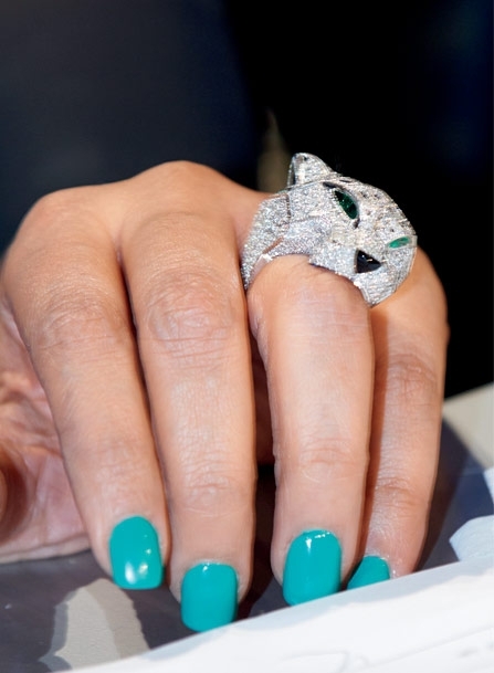 أعشق سلسلة من Cartierولو كان بإمكاني وضعها يومياً لا أمانع. هي عبارة عن سلسلة على شكل نمر مرصّع بالأخضر حتى أني أملك نسختين منها. الأولى مرصّعة بالأخضر والثانية مرصّعة بالأزرق.