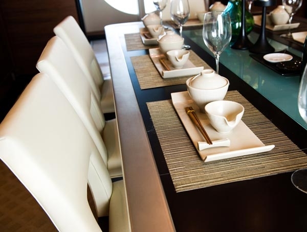 -الجلد من الأٌقمشة التي لا تندثر في الموضة لكراسي طاولة الطعام إلى جانب الفينيل. والأجمل أن تختاريه ابيض اللون.