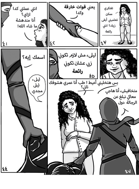 والسبب الثاني يتلخص في أن «الكوميكس» موجّه أساساً إلى شبكة الإنترنت التي يراها الناس في كل أنحاء العالم وليس في مصر فقط، وفي الوقت نفسه النساء المسلمات، وخاصةً المحجبات، يواجهن عدة مشكلات في الدول الغربية لمجرد أنهن محجبات، وينظر الغرب دائماً إلى حجابهن كرمز لضعفهن وخضوعهن، فأردت أن أقول إن الفتاة المحجبة لديها قدرات خارقة أيضاً.