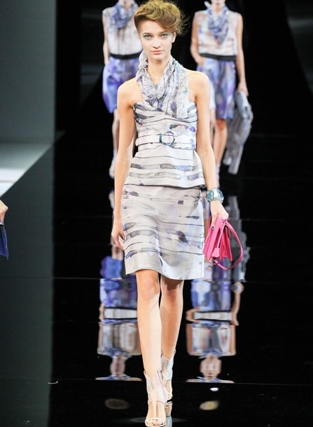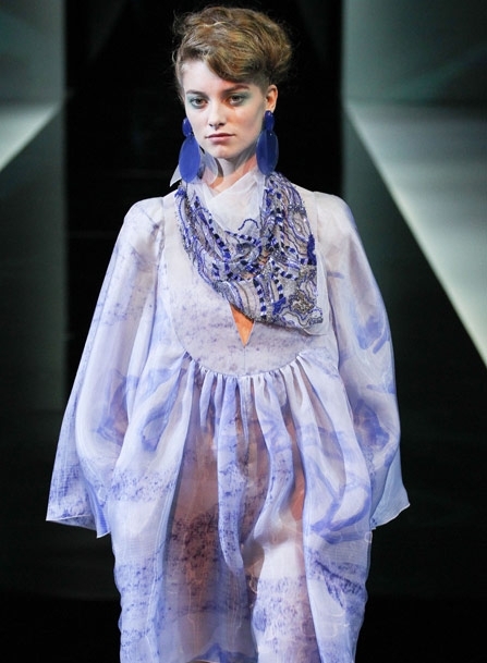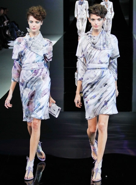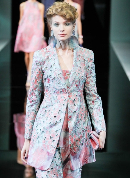 في عرض Giorgio Armani اليوم مجموعة غنية بتصاميم منسدلة ناعمة تتلاعب بالضوء والبرق الأنيق الخافت. هذه الأزياء تصور حديقة ساحرة ولكن تحت المحيط بألوانه المتماوجة بين درجات الأزرق والكورال، وأقمشة حريرية مطرزة.
