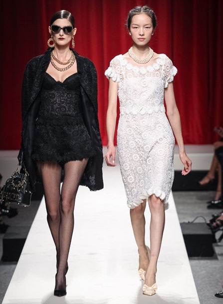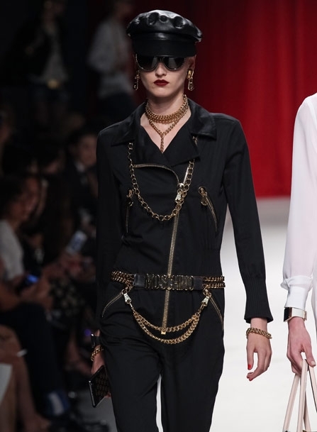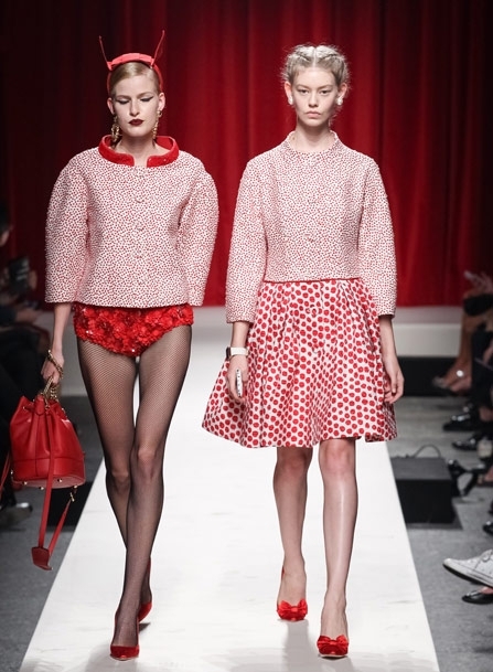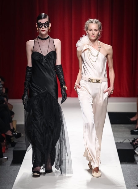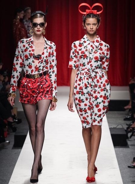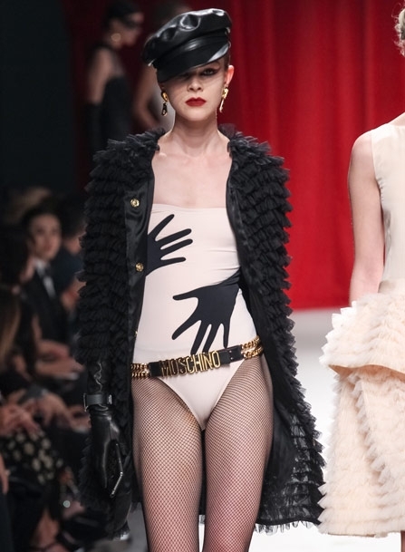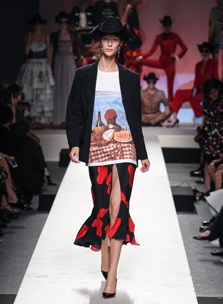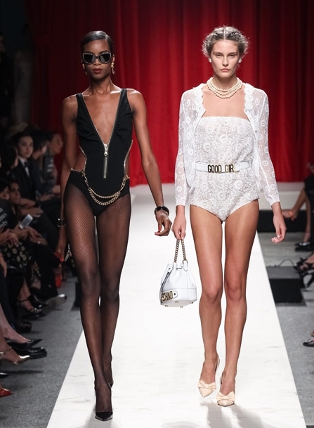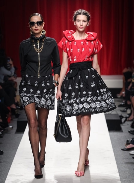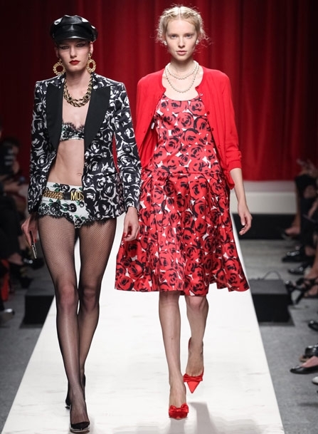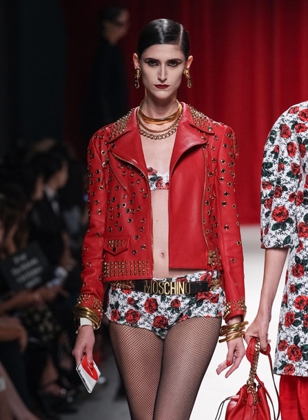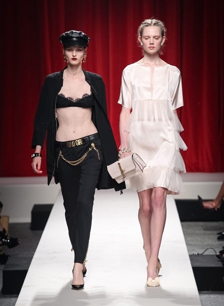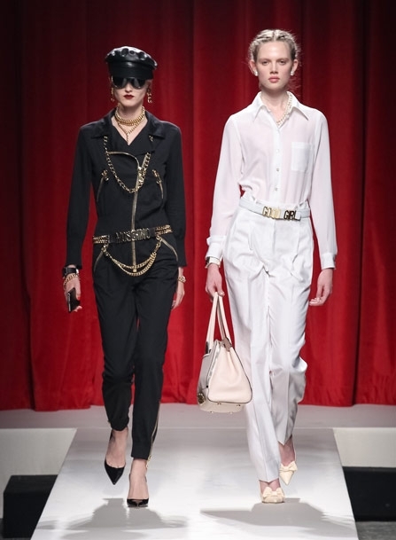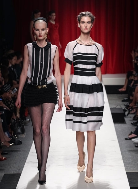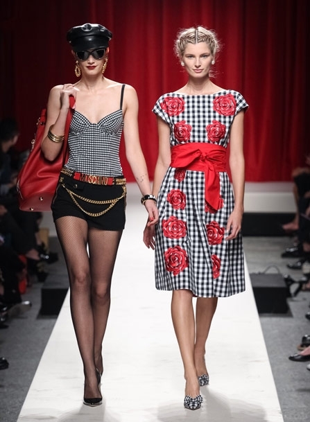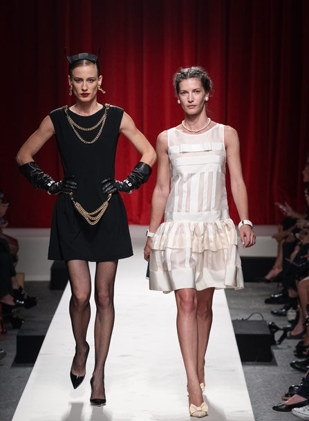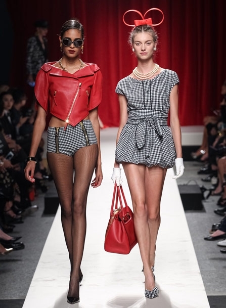 قدّمت Moschino في عرضها للصيف المقبل مجموعة من الأزياء التي يمكن أن ترتديها المرأة بطرق مختلفة، تمنحك إمّا طلّة ناعمة وبريئة، أو فاتنة وجذّابة. أزياء لا يخلو منها جو المرح مع تصاميم بالأسود والأبيض بقصّات هندسيّة، السحابات والسلاسل الذهبيّة بأحجامها الضخمة، السترة القصيرة، الكشاكش على أزياء من التول، والأحمر المنقوش بالورود والنقاط والرسوم المختلفة.