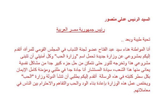 "ها هي محاكم الأسرة فيها ما لا عين رأت ولا أذن سمعت من الحكايات المأسوية، وها هي صفحات الحوادث مليئة بالجرائم التي تخرج عن نطاق الإنسانية، ومعظمها يرجع سببه إلى أن الناس لم تعد تتعامل بالأصول، ونسيت قلوبها قيمة الحب والمودة والرحمة، لا صغير يحترم كبيراً، ولا كبير يقدر الضغوط المحيطة بالصغير"، هكذا كتبت هناء عبد الفتاح، عضو لجنة الشباب في المجلس القومي للمرأة، في نص مشروعها الذي تقدمت به إلى رئاسة الجمهورية لإنشاء "وزارة الحب"، لتكون ضمن الحقائب الوزارية في مصر.