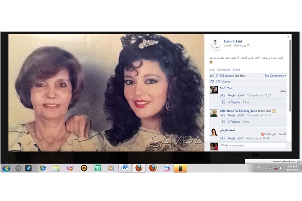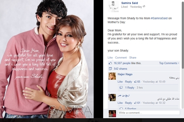 أما سميرة سعيد فنشرت، من خلال صفحتها الرسمية على فيس بوك، نص الرسالة التي تلقتها من ابنها الوحيد شادي؛ المُقيم في لندن لاستكمال دراسته وتقول الرسالة: "Dear mom, for all your love and support, I am so proud of you and I wish you a long life full happiness and success" .