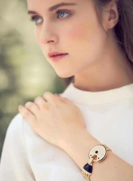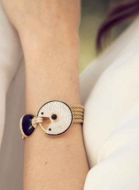 سوار أموليت دي كارتييه بحجم كبير من الذهب الأصفر والماس مع أحجار أونيكس ولكر أسود وسلاسل من الذهب الأصفر.