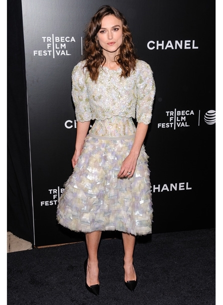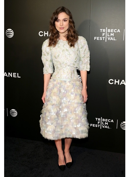ارتدت النجمة البريطانية كيرا نايتلي فستاناً مزخرفاً بالترتر الأزرق والأخضر من مجموعة دار شانيل للأزياء الراقية (موسم ربيع وصيف 2014) في العرض الأول من فيلمها Begain Again في نيويورك. وقد فضلت بطلة A Dangerous Method أن تنتعل خفاً أنثوياً بكعب عالٍ من Jimmy Choo في مهرجان "تريبيكا" السينمائي، بخلاف الحذاء الرياضي الذي ظهرت به عارضة الدار الفرنسية العريقة على المنصة. ولكي يتناسق الماكياج مع الطلة، اختارت اختصاصية الماكياج كايت لي Kate Lee ماكياجاً حيادياً وطبيعياً، وإنما غنياً بالتركيبة. لا تحجبي عينيك عن تسريحة كيرا المموجّة!
