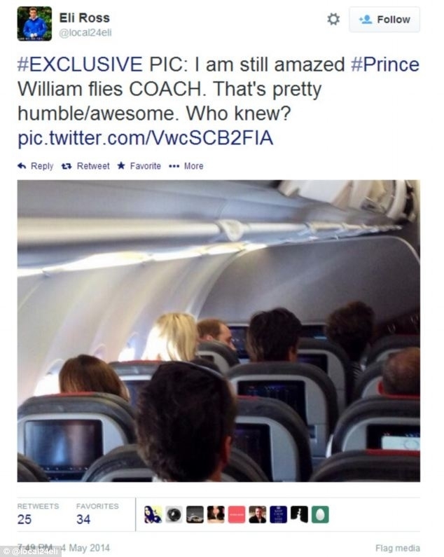 هذه تغريدة مراسل قناة «ميمفيس تي في» إيلي روس، الذي قال إنه جلس خلف الأمير وليام المصنف ثاني على عرش بريطانيا في الدرجة الاقتصادية على متن طائرة تابعة لشركة «أميركان أيرلاينز» كانت في طريقها من ميمفيس إلى دالاس.