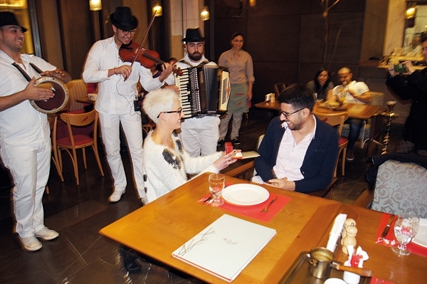 في تلك الليلة كان المشروع بالنسبة إلى خطيبي عبارة عن عشاء هادئ ولم يتوقع أبداً أن يتحول إلى مهرجان حيث تتجه الأنظار كلها إليه. فجأة وجد نفسه محاطاً بالفرقة الموسيقية وبحشد من الناس اجتمعوا من حولنا للمشاهدة والتقاط الصور والفيديو. ردة فعله الأولى كانت الدهشة، ولكن حين جثوت على ركبة واحدة وقدمت له خاتم الخطوبة ظهرت على ملامحه البسمة والفرحة.