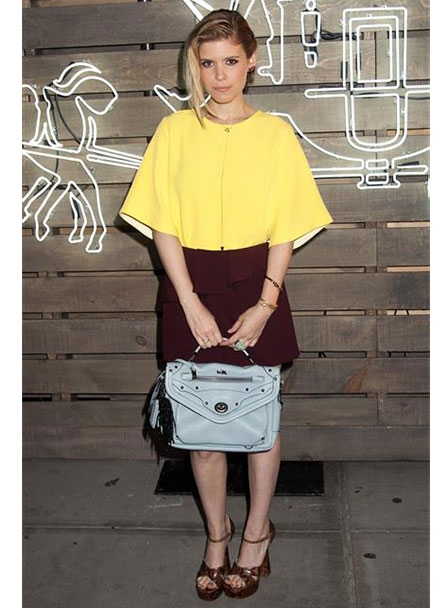 كايت مارا تفضّل الطلّة المريحة في الأيام الحارة، فاختارت السروال القصير مع تي-شيرت بسيطة وحذاء بكعب مسّطح وتجوّلت في شوارع نيويورك من دون ماكياج وربطت شعرها بعفويّة واكتفت بالنظارتين الشمسيّتين. أمّا في الليلة نفسها، فقد اختارت طلّة الآنسة الأنيقة، وارتدت بلوزة باللون الأصفر بكمين واسعين، مع سروال قصير بلون برغنديّ وكشاكش على الخصر من Sandro، وحقيبة Coach الجديدة بلون أزرق باستيل. لاحظي جرأتها في مزج الألوان!