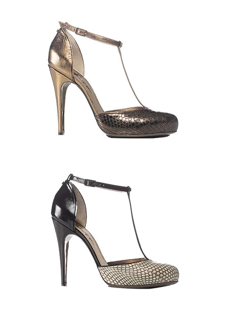 الأقمشة اللماعة التي تم استخدامها في عرض الأزياء تحولت إلى أوشحة معقودة حول الكاحل، ملتفة فوق أحذية Lanvin Pump العالية الكعب. كما تتوافر هذه الأحذية على شكل صنادل مفتوحة مصنوعة من جلد عجل مطبع بنقوش الأفعى مع كعب رفيع. أما الحذاء المزود برباط عمودي ورباط حول الكاحل وقطعة سوداء أو بيضاء فوق القدم فيمتاز أيضاً بمنحنياته الأنيقة المصنوعة من جلد الغنم البرتقالي أو الفوشيا، وجلد الأفعى الأسود أو الأبيض الباهت.