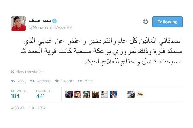 "اصدقائي الغالين كل عام وانتم بخير واعتذر عن غيابي الذي سيمتد فترة وذلك لمروري بوعكة صحية كانت قوية الحمد لله اصبحت افضل واحتاج للعلاج احبكم".