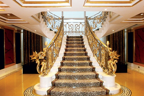 وإلى جانب الجناح سلالم حلزونية الشكل تفصل ما بين الطابق العلوي حيث غرف النوم والحمام وما بين الطابق السفلي الذي يضم صالة الاستقبال والمكتب وغرفة الجلوس. أما الحمام، فاعتمد في الديكور على الموزاييك كما في كل أجنحة الفندق ليكون طابعه عربياً بامتياز.