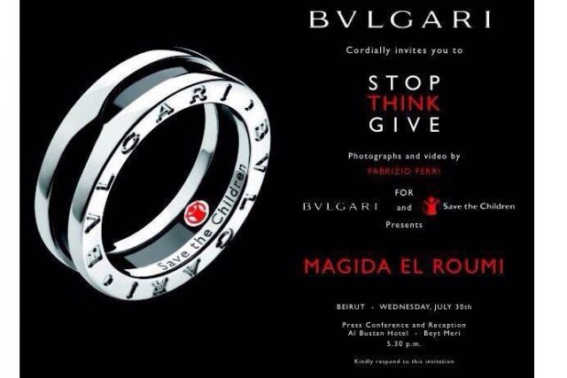 أحرزت «بولغاري» Bulgari نجاحاً هائلاً مع مبيعاتها للخاتم المصنوع من الفضّة والسيراميك (المصمّم خصيصاً) التي ساهمت في تحقيق الهدف الطموح والقاضي بجمع 27 مليون دولار أميركي (20 مليون يورو) من التبرّعات لصالح منظمة إنقاذ الأطفال Save the Children، بما يتعدّى بكثير الهدف الذي تمّ تحديده في العام 2009 عندما بدأت الشراكة. منذ العام 2009، التزمت «بولغاري» Bulgari في أحد أكثر الجهود نجاحاً في مجال المسؤولية الاجتماعية واستثمرت جهودها من أجل مستقبل مئات آلاف الأطفال المحرومين حول العالم ما سمح بالوصول مباشرةً اليوم إلى أكثر من 600 ألف من أكثر الأطفال عوزاً في العالم في 23 دولة. وسيتم بيع الخاتم المستوحى تصميمه من مجموعة بولغاري الأيقونية B.zero1 بالإضافة إلى قلادة من المجموعة نفسها بقيمة480 دولاراً ، سيعود 100 دولار منها للمساهمة في مساعدة أطفال الحروب منهم أطفال ثاني أكبر مخيم للاجئين في العالم، ألا وهو مخيم الزعتري في الأردن. وفي 19 تشرين الأول/أكتوبر، سوف تنطلق ماجدة الرومي مع مندوبين من منظمة Save The Chidren في رحلة ميدانية لزيارة مخيم الزعتري، كما سيزور الفريق حضانة «قوس قزح»، واحدة من ثلاث حضانات أنشأتها منظمة Save The Chidren بدعم من Bulgari، حيث يتولى أساتذة مدرّبون تعليم برامج لقرابة 6000 طفل تراوح أعمارهم بين الثالثة والخامسة. يذكر أن ماجدة الرومي خضعت لجلسة تصويرية وهي تضع الخاتم بعدسة المصوّر الشهير فابريتزو فيري الذي التقط الصور نفسها لميغ رايان وناومي واتس وكاميلا بيل وأوليفر ستون...