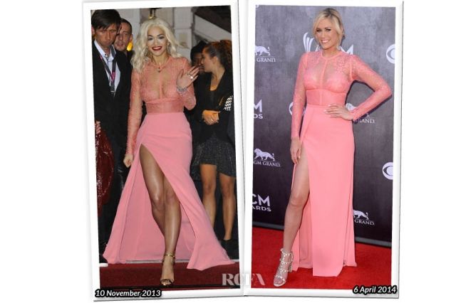 كانت المغنية ريتا أورا أول من ارتدى فستان إيلي صعب الزهري وذلك في العاشر من نوفمبر 2013. بعدها، في السادس من ابريل 2014 ارتدت الفستان نفسه الكاتية سارة ديفدسون وتألّقت به، أما أخيراً فقد ارتدته النجمة اللبنانية إليسا.