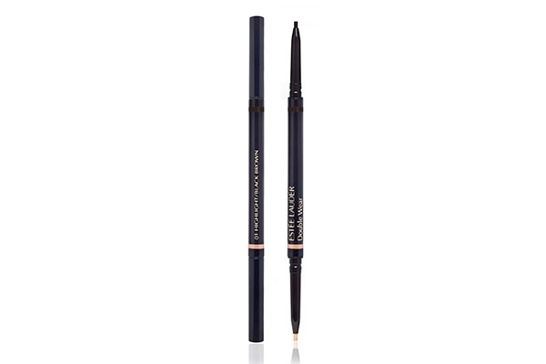 مشّطي حاجبيك ونسّقيهما باستعمال Estée Lauder Double Wear Stay-in-Place Brow Lift Duo in Soft Brown no.03 واصقلي رموشك بواسطة الماسكارا السوداء المضادة للماء والسيلان Guerlain Cil D’Enfer Waterproof Mascara.