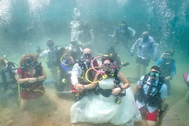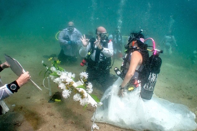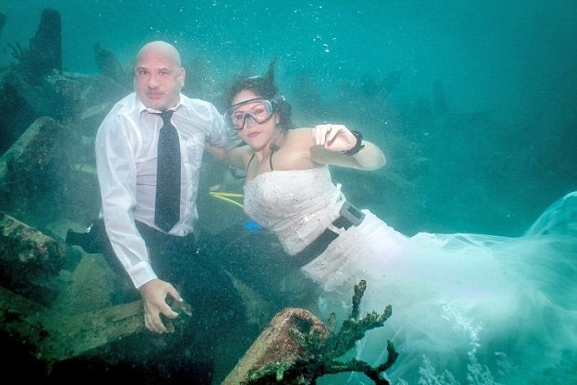 قرر الحبيبان الأمريكيان بيل وليزابيث فرينير إقامة مراسم الزفاف تحت أعماق 30 قدما في المحيط الأطلنطي، أما "المعازيم" فكانوا 20 من أقاربهما وأسماك قرش!