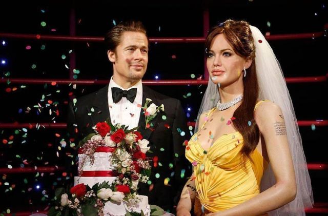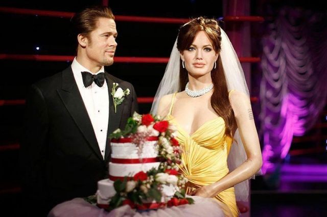 في متحف الشمع Madame Tussauds في لندن، حرص القائمون على الاحتفال بزفاق أنجلينا جولي وبراد بيت على طريقتهم الخاصة، فأحضروا قالب حلوى وألبسوا أنجيلينا المصنوعة من الشمع طرحة زفاف.