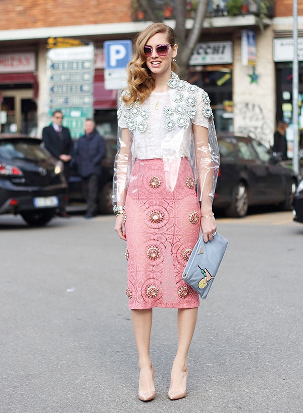 ارتدت كيارا تنورة مستقيمة من الدانتيل مطرّزة بالأحجار الملوّنة مع بلوزة عاديّة بيضاء، ولكنّها أضافت «سترة» من البلاستيك الشفاف مرصّعة بالأحجار أيضاً. أما حذاؤها فتركته كلاسيكياً بلون بيج حيادي بالكاد تراه العين، وهو اختيار صائب لطلّتها. أكسسواراتها أيضاً تدل على حبّها للموضة وجرأتها، فهي حملت كلاتش من Prada ووضعت نظارتين لمّاعتين بلون الفوشيا!