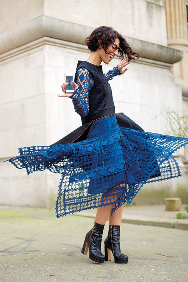 من الواضح أن هذه الفتاة تعشق ما ترتديه، وهذا هو الهدف من الموضة أساساً، أن تشعرك بجمالك وثقتك بنفسك. اختارت هذه الشابة السمراء فستاناً طويلاً من الكروشيه باللون الأزرق بطول غير متساو، مع كنزة من دون كمّين بسحاب مفتوح من الأمام، وطويلة في الخلف. كما انتعلت جزمة قصيرة من الجلد الأسود بكعب مرتفع ولكن مريح. نظارتاها بسيطتان. أجمل ما فيها، ابتسامتها.