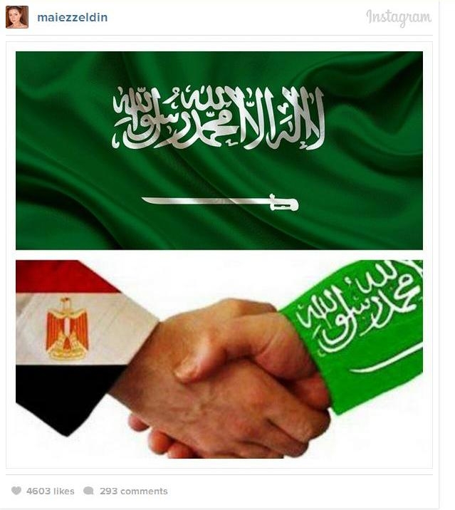 أما مي عز الدين فوضعت صورة مجمعة لكل من علم السعودية ويدان تتصافحان، ترتدي إحداهما العلم المصري بينما الأخرى ترتدي الأخرى العلم السعودي.